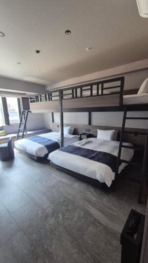 They also have connecting rooms -so you can have one set of bunks in one room connected to a room with another set of bunk rooms making it a total of 4 people (and you could get several of these types of rooms for larger families.) The Karasuma Gojo option has rooms with two sets of bunk beds (ie. sleeps 4 people in one room) AND they have an option with one set of bunk beds and two single beds pushed together to make one big bed (ie. sleeps 4 people in one room.)