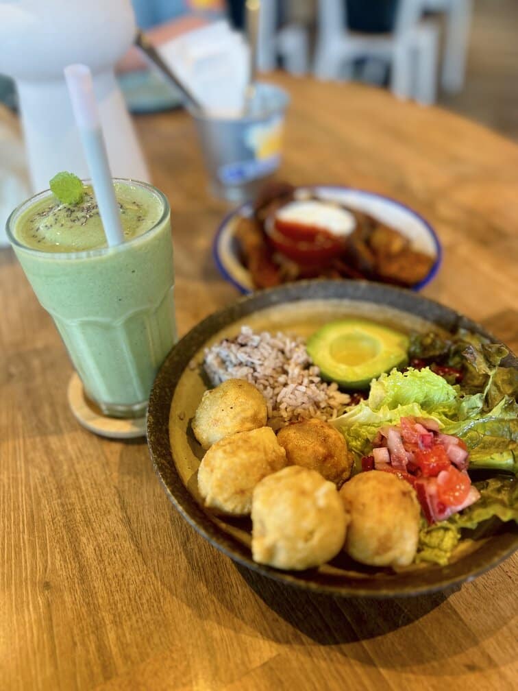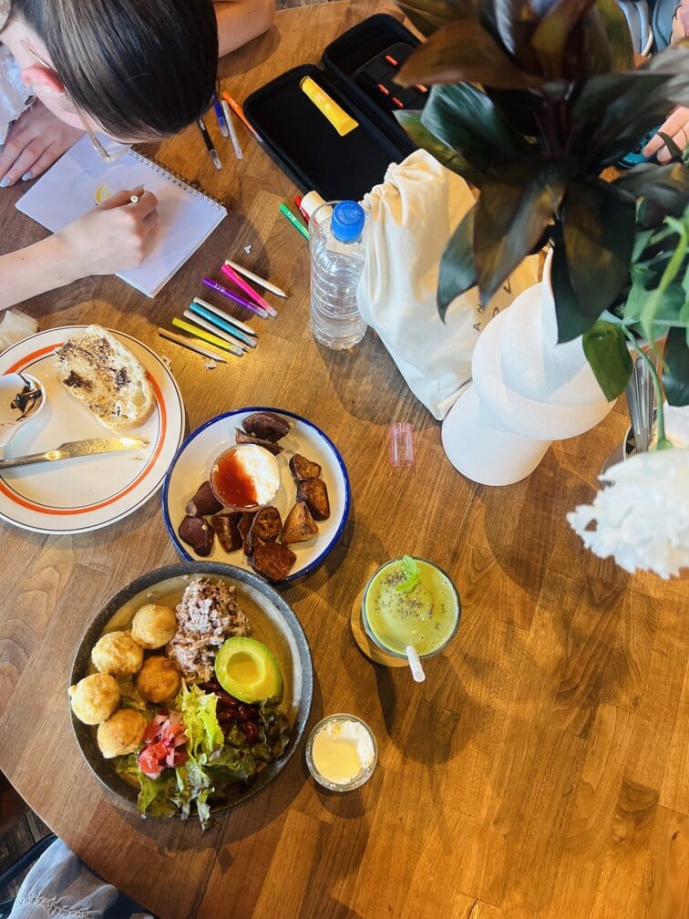 The Falafel Plate, Green Peace Smoothie, Potato Wedges, Vegemite on Toast! Oh and some colouring.
