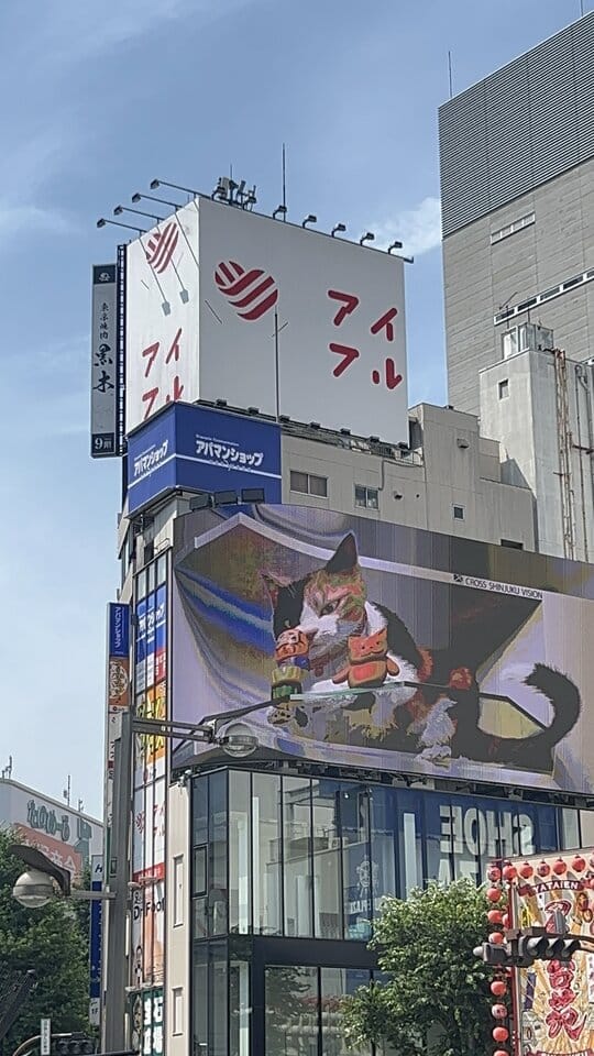 Put “3D Cat Cross Shinjuku Space” into google maps to find this 3D billboard easily. It often means walking through the underpass under the train lines – google maps will help get you there.