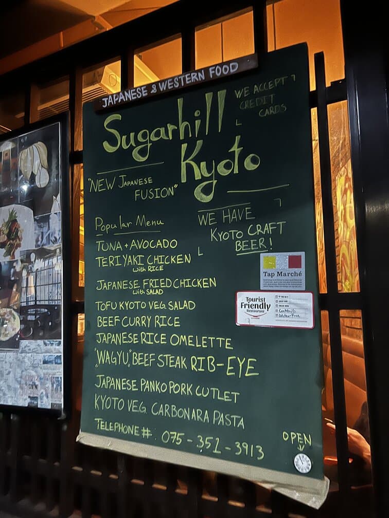 Budget 2000 yen per person to dine here. They accept most major credit cards. See the full menu at Moon and Back Kyoto here. Ask your hotel to call and make a reservation. This restaurant has space for strollers AND high chairs. They have an English menu.